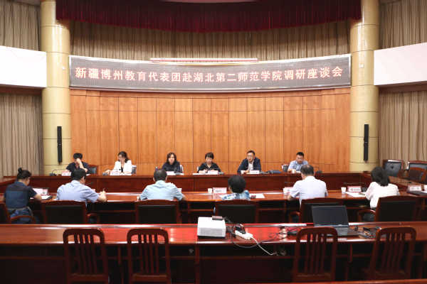 新疆博州教育局相关领导、湖北省教育厅发展规划处相关负责人,我校党政办公室、学生工作部、招生就业处、教师教育学院、两训中心、光谷教育学院等部门负责人参加座谈。(摄影 周热)