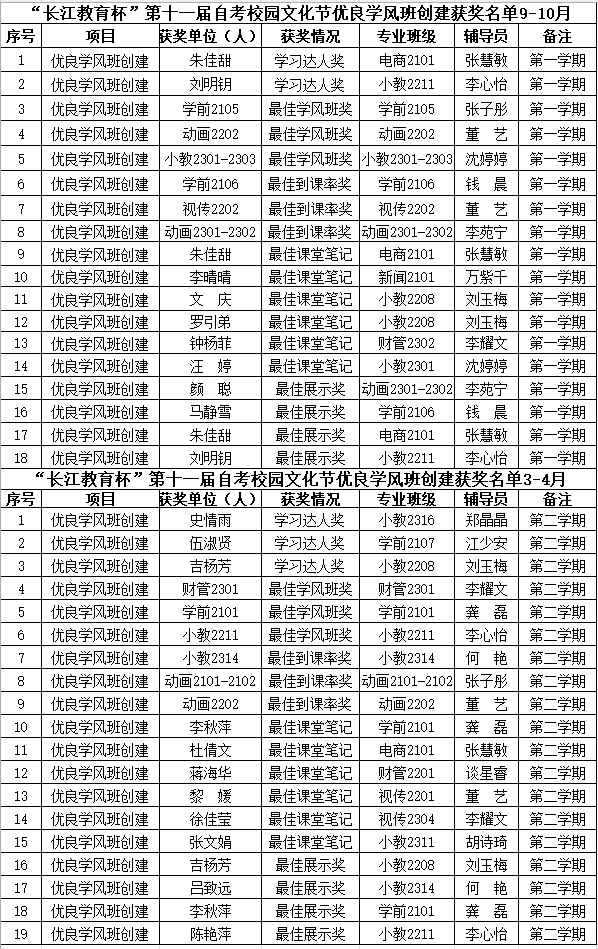 为促进学风建设,树立优良学风班级典型,发挥榜样的引领作用,切实做好学生的教育和管理工作,2023年9-10月、2024年3-4月我院开展“长江教育杯”第十一届自考校园文化节优良学风班创建活动。此次活动本着“以评促学、以评促考”的原则开展,从到课率、最佳学风、学习达人、课堂笔记、最佳展示等五个方面展开评比。通过教务、学工查课数据统计,学前2106班等6个班级获得最佳到课率奖;根据学业综合评价过程成绩优秀比例及班风、学风等情况,学前2105班等6个班被评为最佳学风班;根据考前强化辅导效果和优秀学习委员日常班级课堂管理等情况,朱佳甜等5名同学获得学习达人奖;通过展示学生课堂笔记书写情况,黎媛等12名同学获得最佳课堂笔记奖;结合PPT内容展示和现场演讲等方面,吉杨芳等8名同学获得最佳展示奖。
